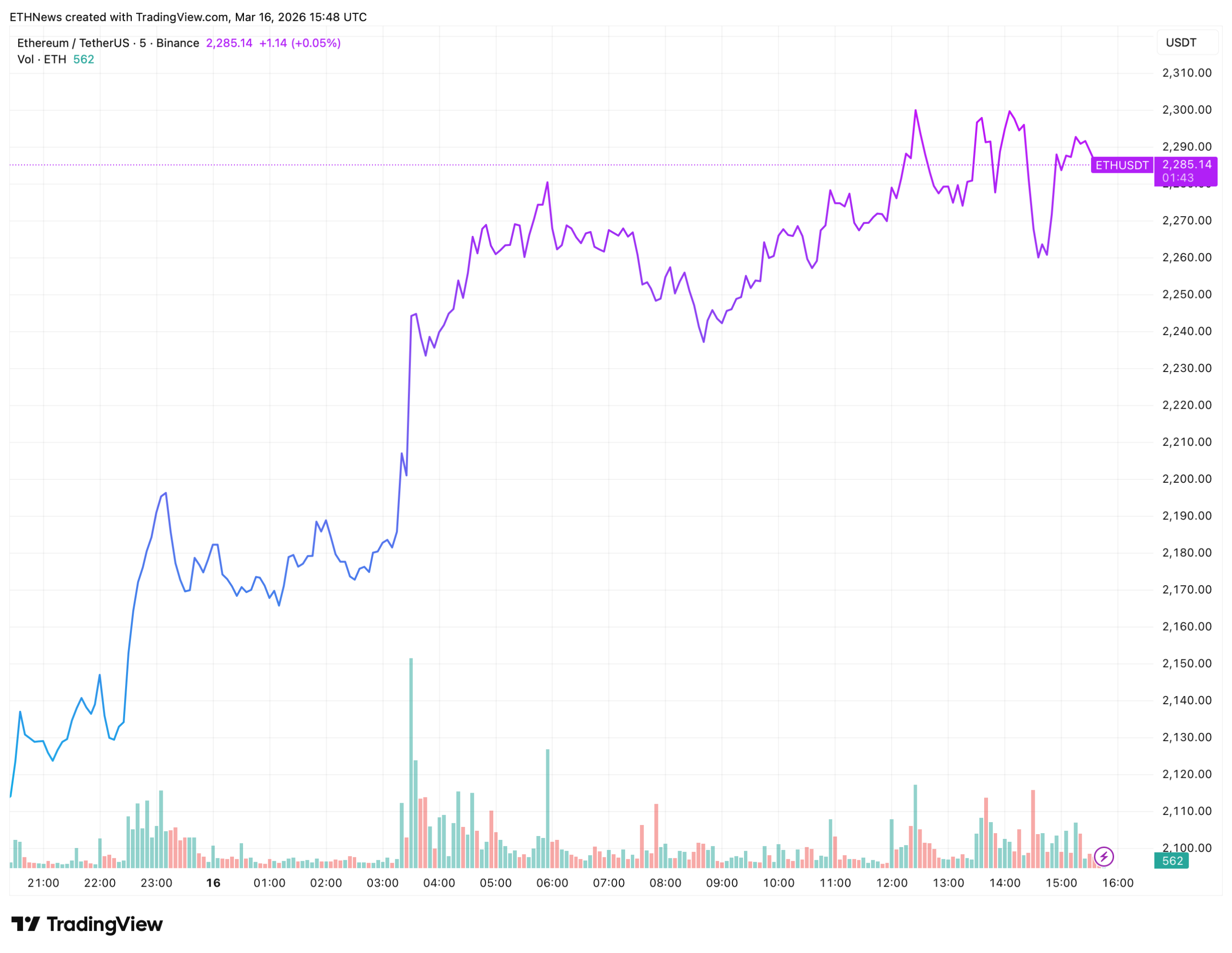 The decisive move came in the early hours of March 16. ETH launched from roughly $2,195 to $2,270 on the heaviest volume bar of the entire session. Clean, vertical, confirmed. From that point the purple session candle took over and ETH never gave the move back. It ground higher through the morning, touched $2,305, pulled back briefly to $2,260, then settled near $2,285 at the time of writing.