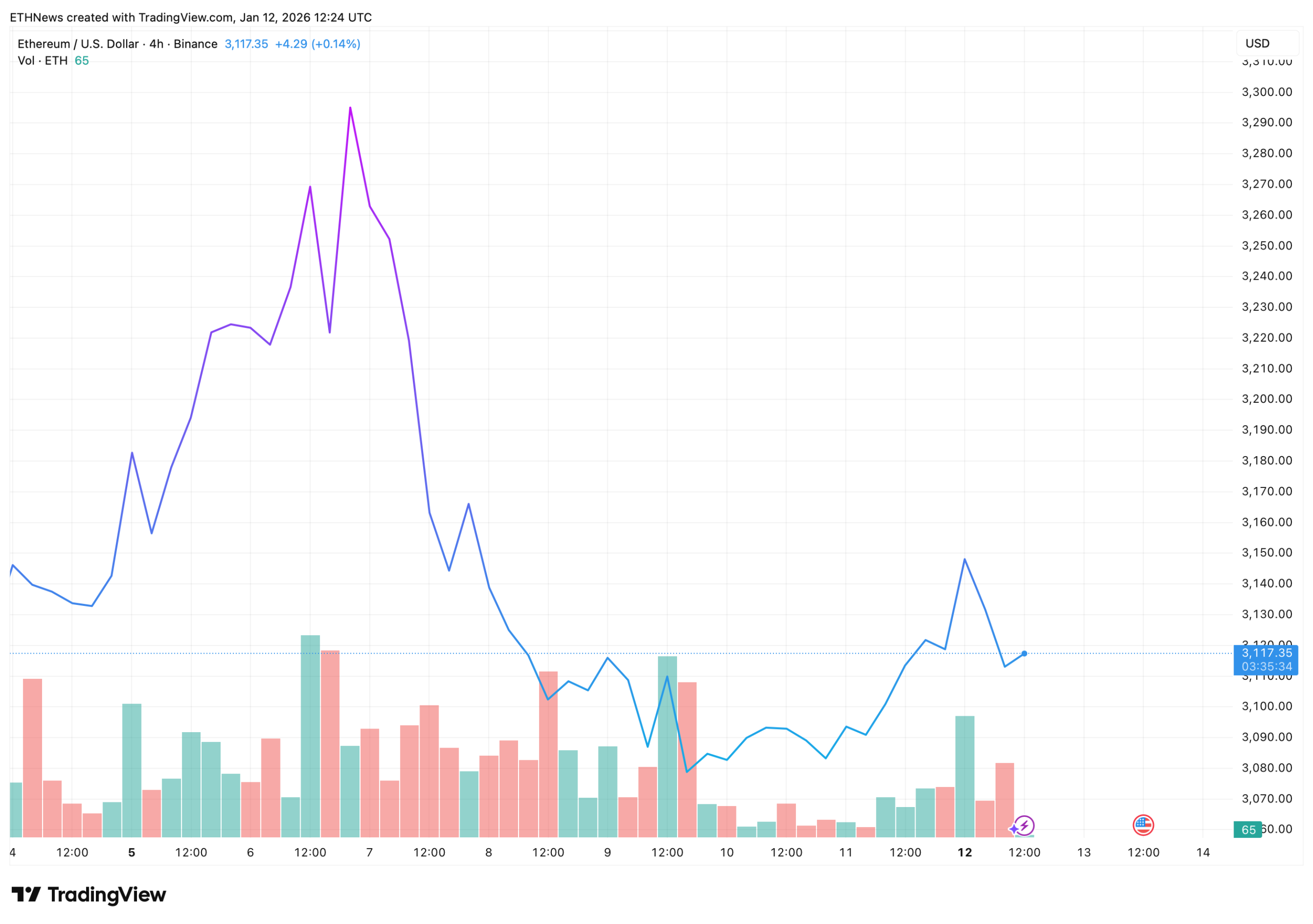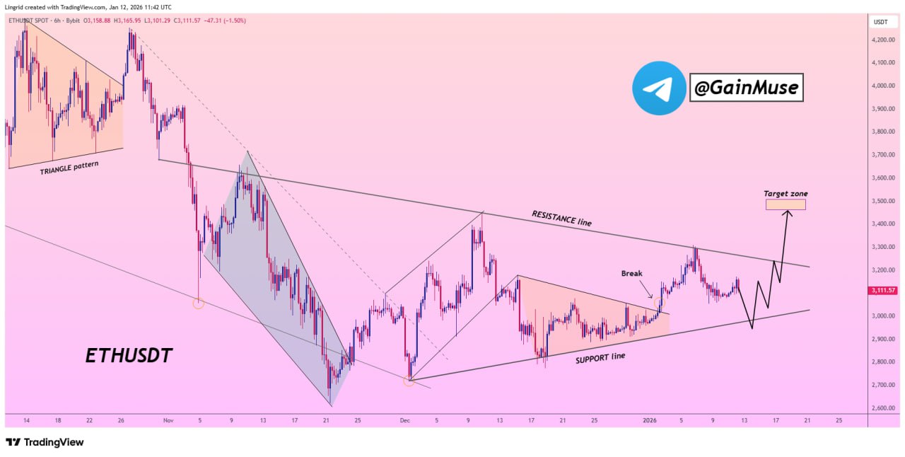 After the sharp drop earlier this month, sellers failed to push price meaningfully lower. Since then, ETH has been building a base above the $3,100 area, with price repeatedly bouncing from a rising support line while leaning into overhead resistance.