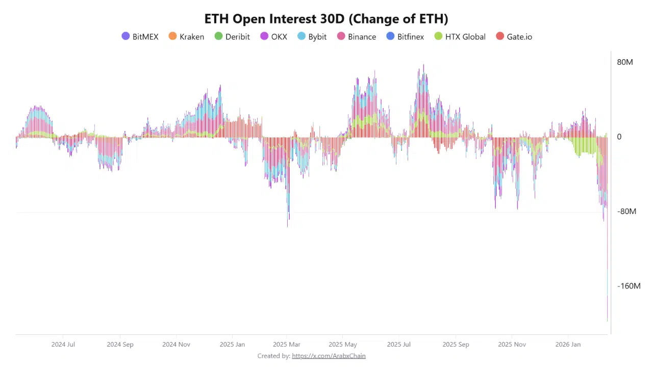 Ethereum’s derivatives market has entered a clear deleveraging phase, with net open interest (30-day change) showing substantial outflows across leading exchanges.