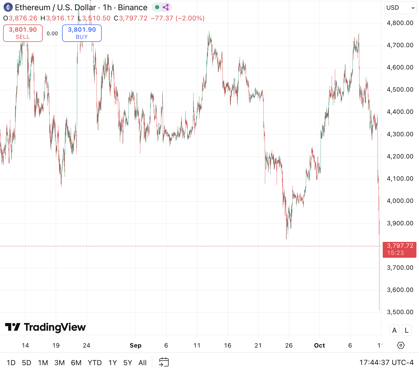 Ethereum (ETH) joined the broader market sell-off late Friday, plunging 13.7% in 24 hours to around $3,797 at the time of writing, according to CoinMarketCap. The move came amid a wave of liquidations across the crypto market, where over $5 billion in leveraged positions were wiped out within a single day.