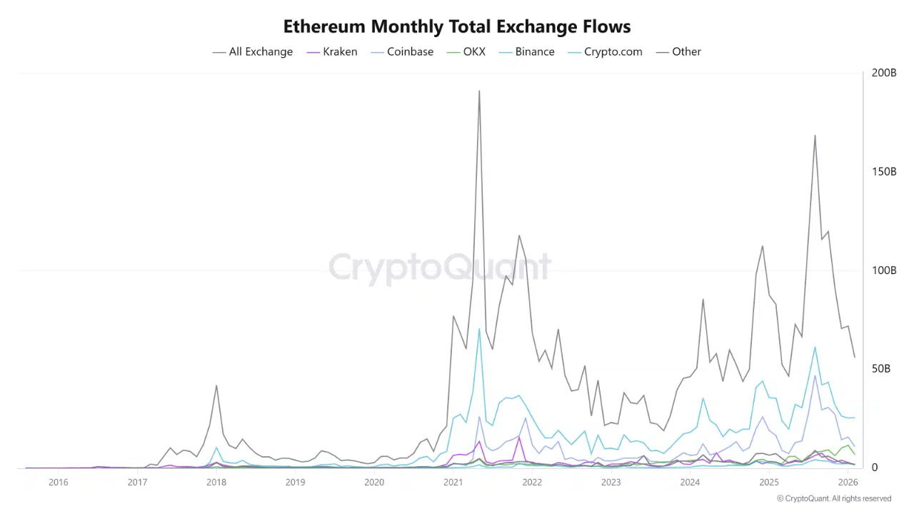Ethereum exchange inflows totaled approximately $56.1 billion in February, marking the lowest monthly level recorded in the past year.