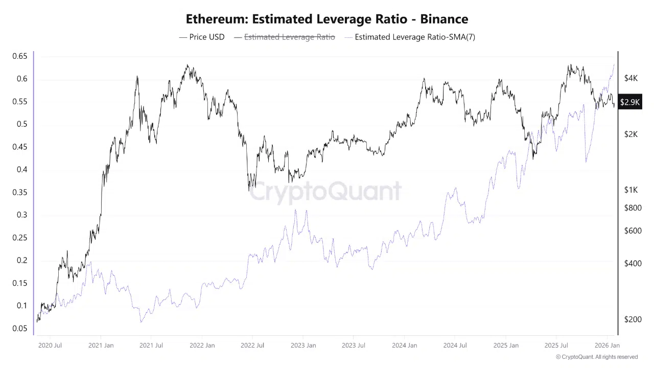 According to a report shared by CryptoQuant, Ethereum’s Estimated Leverage Ratio on Binance is holding at an all-time high, increasing the probability of abrupt price swings driven by liquidations rather than organic spot demand.