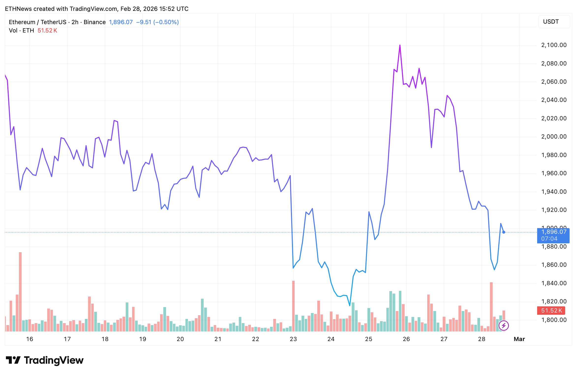 The two-hour chart from February 14th through February 28th captures one of the more volatile two-week windows Ethereum has experienced this cycle. Price opened the period near $2,070, declined gradually through the mid-$1,900s, then collapsed sharply on February 22nd and 23rd to a low around $1,820 on some of the highest sell volume visible across the entire chart window.