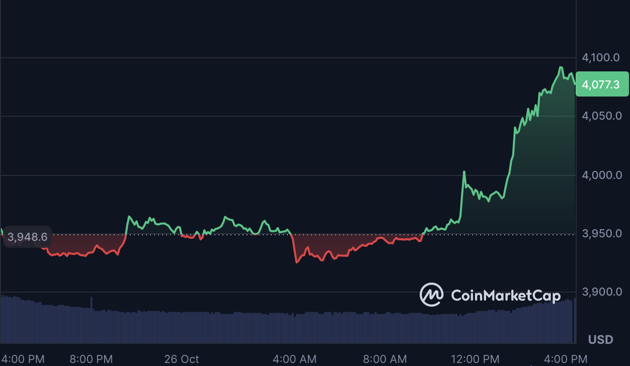 Ethereum (ETH) climbed more than 3% in 24 hours, trading above $4,075 according to CoinMarketCap data, as improving sentiment around U.S.–China trade negotiations lifted global risk assets.
