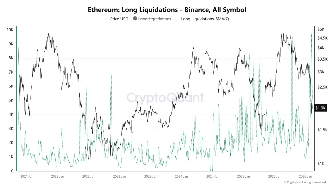 On February 6, 2026, the 7-day Simple Moving Average of long liquidations on Binance climbed to 9,000 ETH, the highest reading in four years. Because the figure represents a rolling weekly average, it reflects persistent pressure rather than a one-day event.