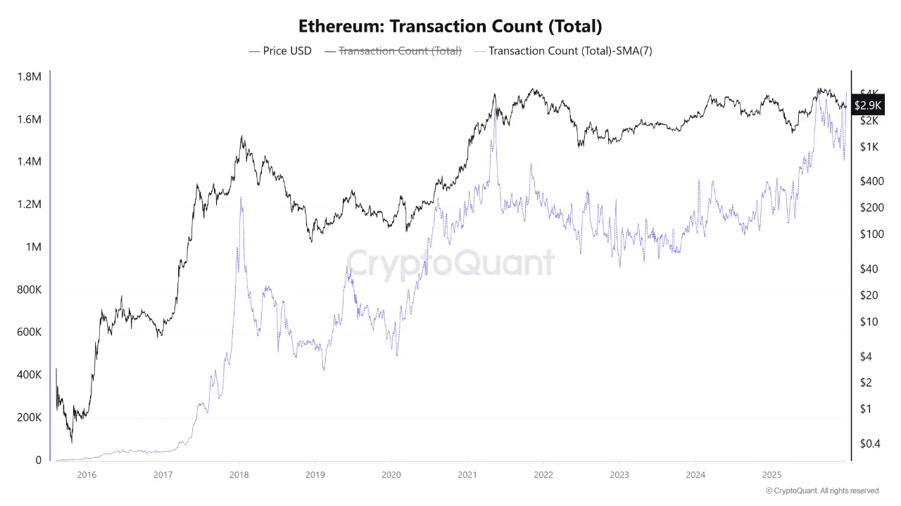 The data centers on Ethereum’s transaction count over time, plotted alongside price. The chart captures long-term trends in both metrics and makes the current divergence immediately visible. Network activity has moved into uncharted territory, while price has yet to reflect a similar breakout.