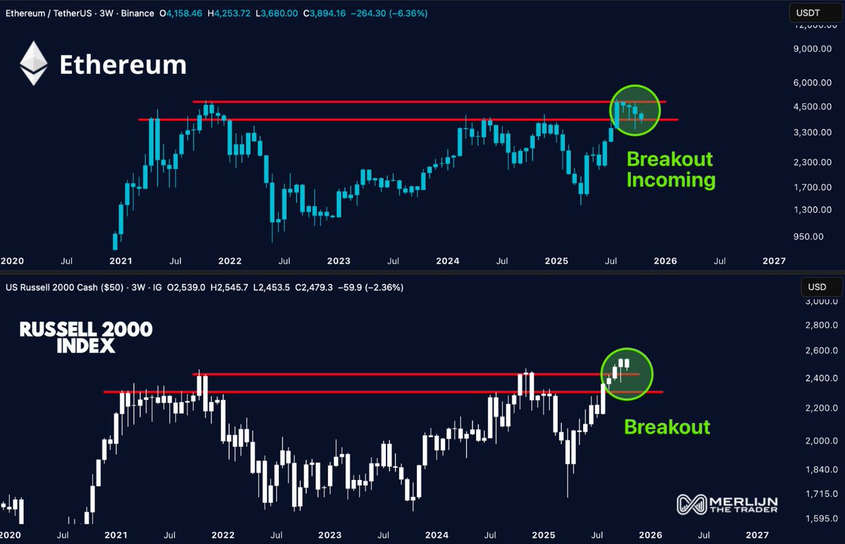 Merlijn also drew macro parallels between Ethereum and the Russell 2000 index, which recently broke out after three years of sideways trading.