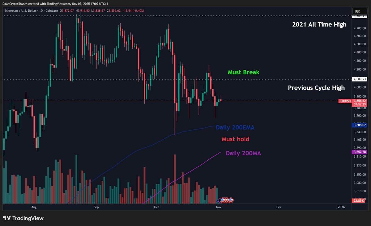 Analyst Daan Crypto Trades noted that Ethereum has been range-bound for weeks, with both local resistance and support repeatedly tested but unbroken. “Eventually, this will end in a big break and large volatility spike,” he said, pointing to key levels between $3,500 and $4,100. The daily chart shows ETH holding its 200-day EMA as short-term support, a zone that must hold to maintain bullish momentum, while $4,089 stands out as the resistance level that needs to be flipped for a structural breakout.