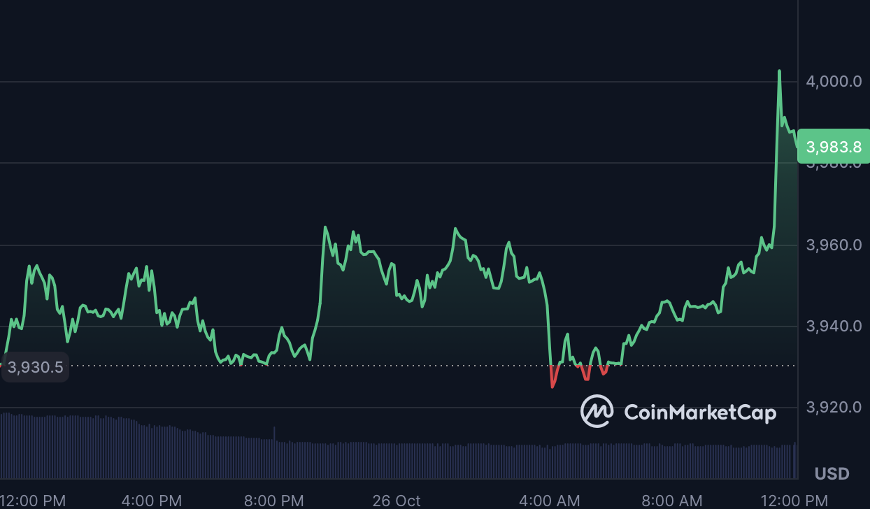 Data from CoinMarketCap shows Ethereum trading at $3,985.79 as of October 26, marking a 1.07% daily increase and pushing its market capitalization to $481 billion. Despite a 43.5% drop in trading volume to $15.18 billion, ETH has shown resilience around the $3,900 level, a price zone that many traders consider a springboard toward retesting yearly highs.