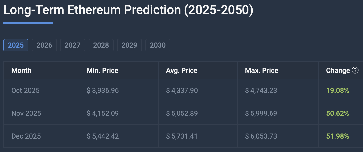 Forecast data from CoinCodex supports this bullish sentiment. Analysts project Ethereum to trade between $3,936 and $6,053 by December 2025, representing a potential 51.94% upside from current levels. The model places Ethereum’s average price for November at $5,052.89, reflecting expectations of continued momentum as investor demand accelerates into Q4.