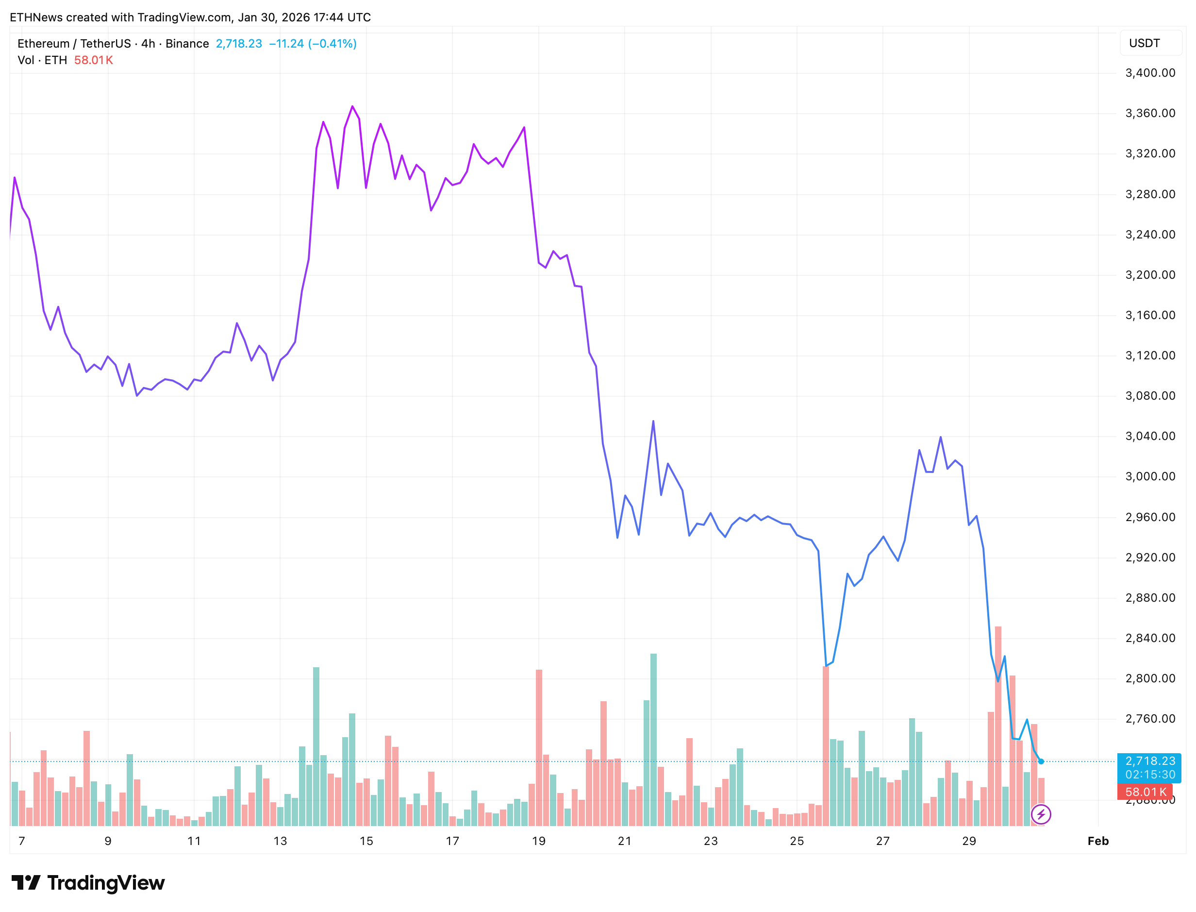 Ethereum is trading near $2,718 on the ETH/USDT 4-hour chart, following a sharp downside move that has pushed price back into a structurally important demand zone.