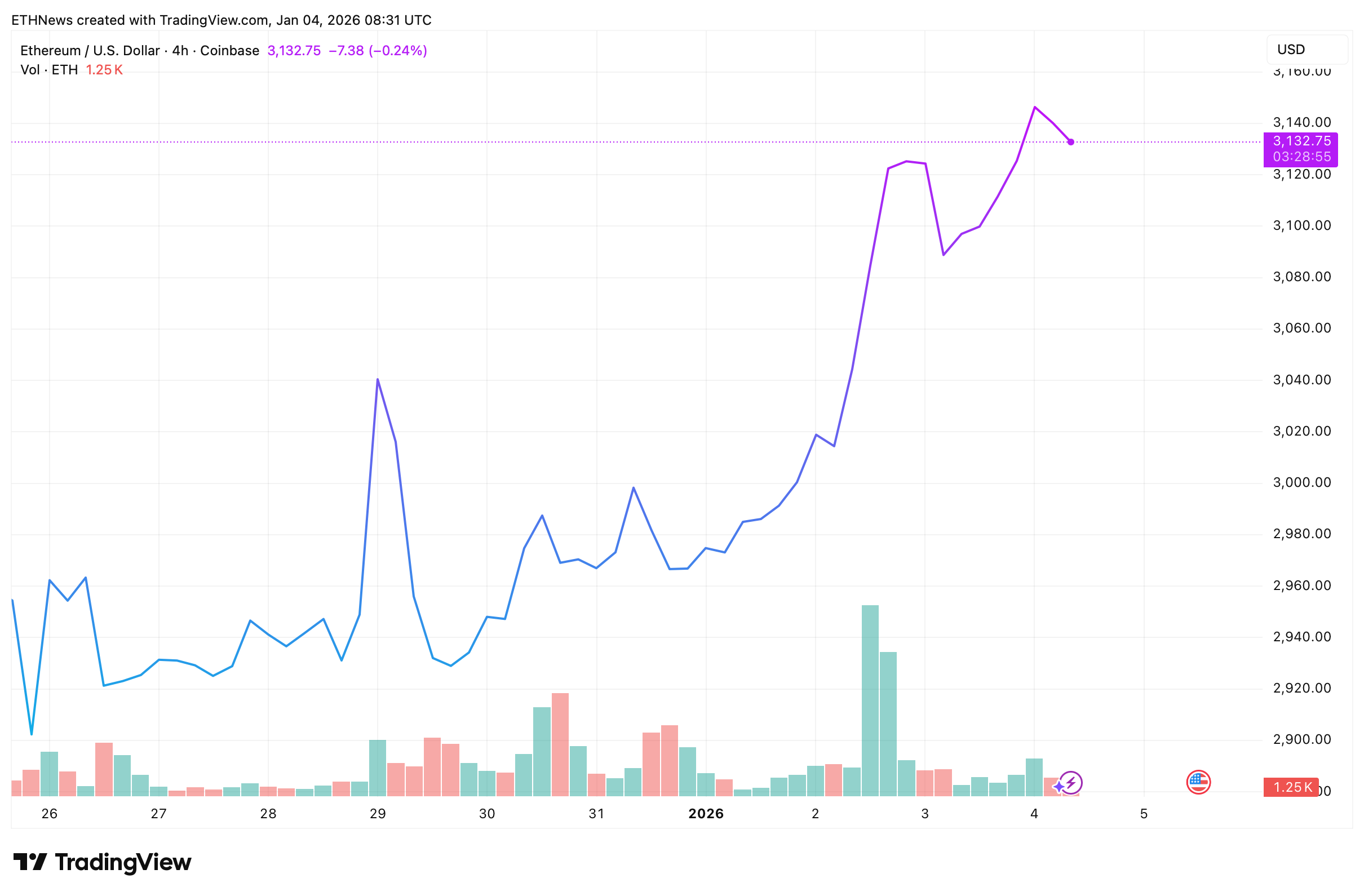 The 4-hour TradingView chart shows Ethereum establishing a clear higher-low structure since December 29. After consolidating below $3,000, price began trending higher into early January, eventually reclaiming the $3,100 area.