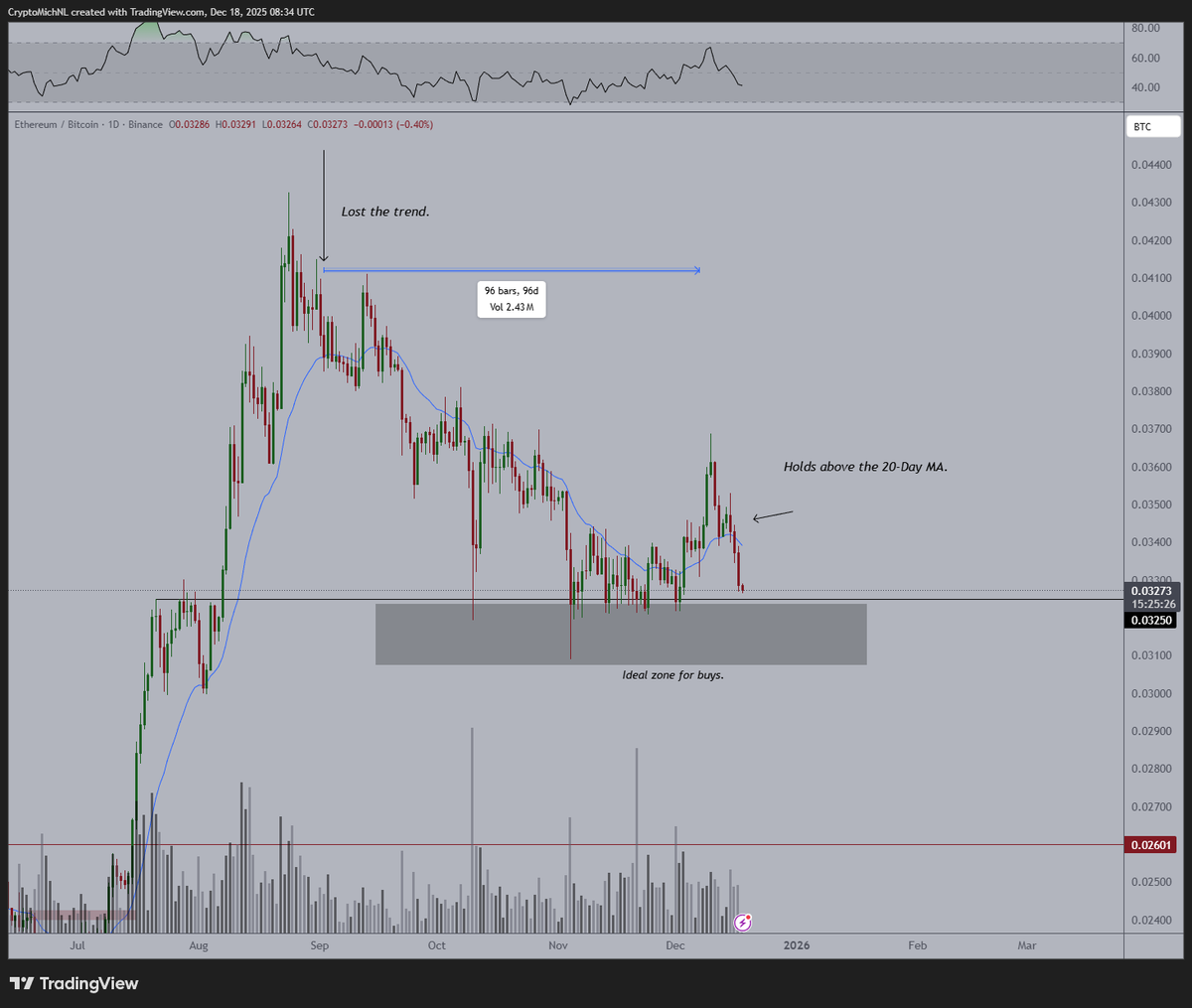 Despite the decline, ETH/BTC is still trading near a broader support zone. Van de Poppe noted that the next 48 hours could be important, as a momentum shift from this area would signal renewed strength across altcoins. Failure to stabilize, however, would reinforce continued caution.