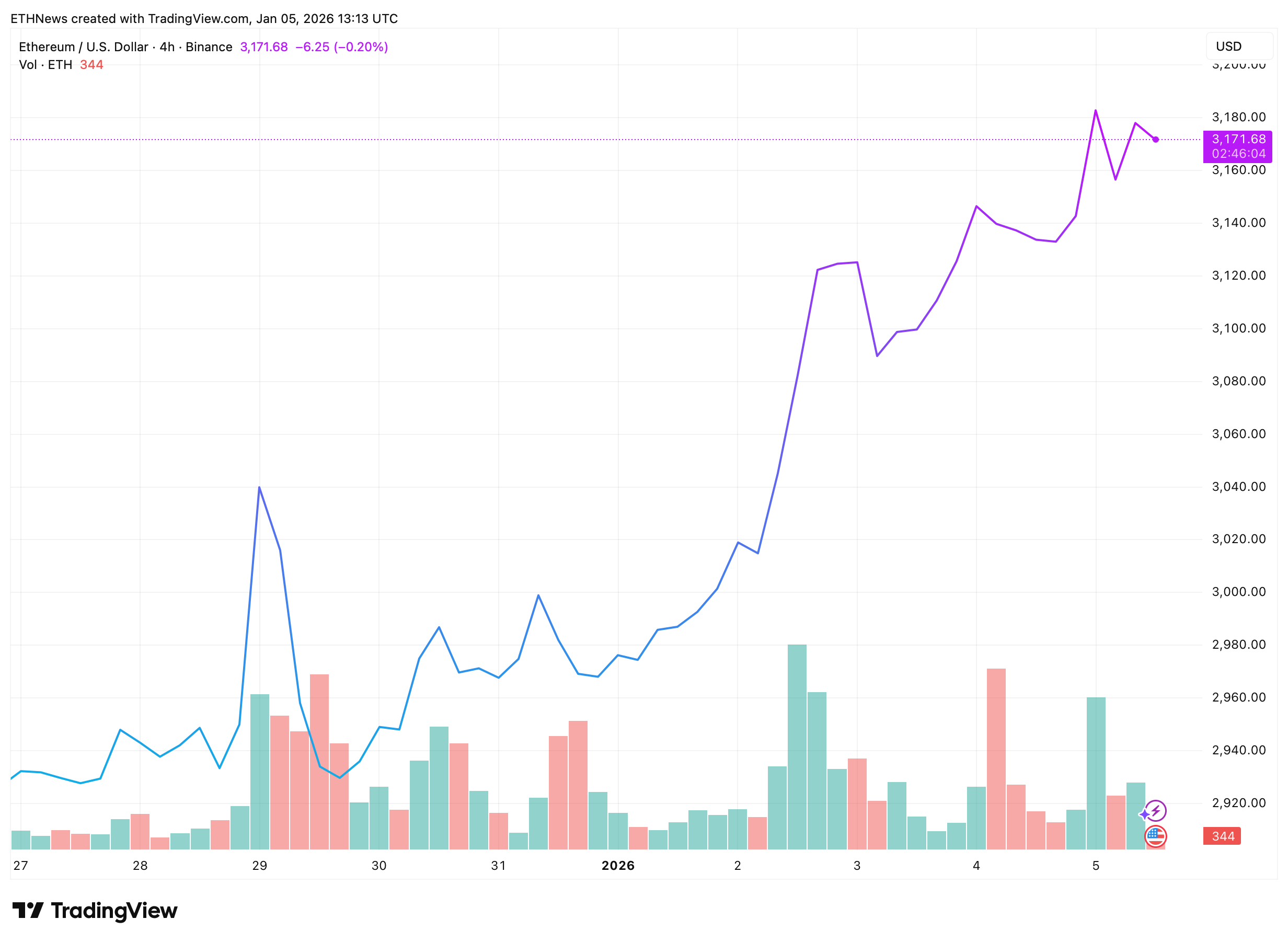 Shorter-timeframe TradingView data shows Ethereum advancing steadily from the sub-$3,000 region toward the $3,170–$3,180 area, accompanied by expanding volume during upside moves. Importantly, pullbacks since the breakout have been shallow, suggesting sellers are failing to regain dominance.