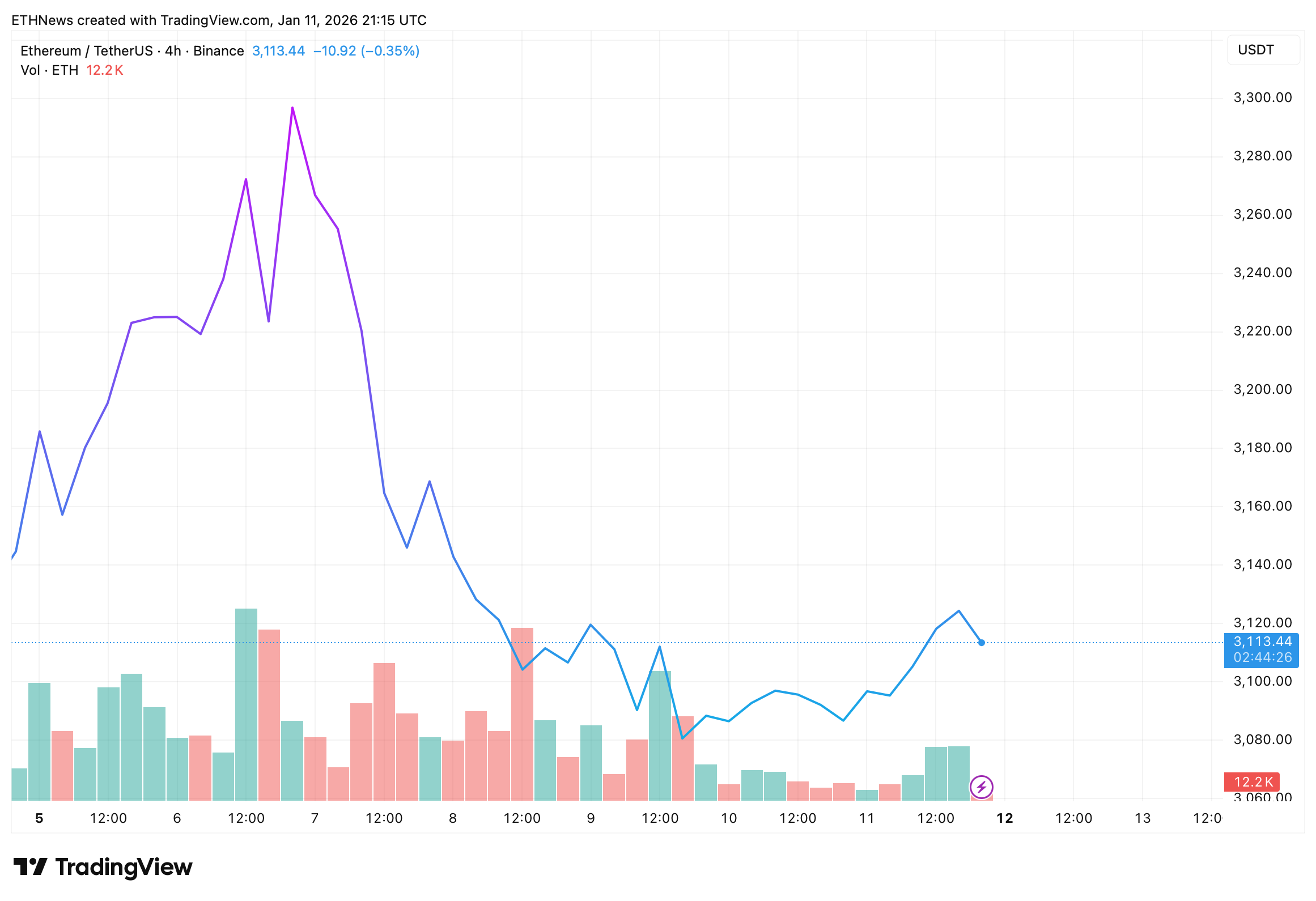 Ethereum is still trading inside a clearly defined range, with neither buyers nor sellers managing to take control. According to the latest TradingView chart, ETH was last trading around $3,113, showing a modest -0.35% move on the 4-hour timeframe. Volume also remains muted, reinforcing the lack of conviction behind recent price swings.