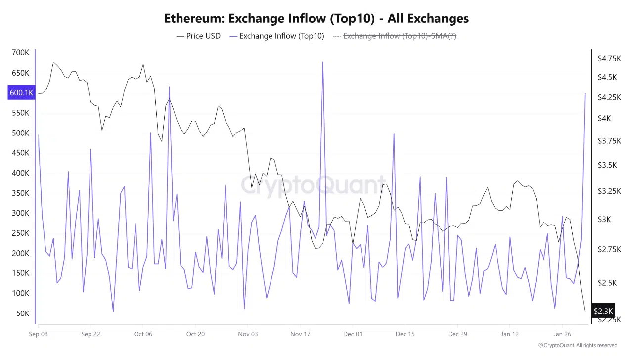 On February 1, Ethereum Exchange Inflow (Top10) on Binance jumped to approximately 357,000 ETH, the highest daily reading since September. At the same time, Exchange Inflow (Top10) across all exchanges surged to roughly 600,000 ETH, marking the second-largest inflow observed during the current period.