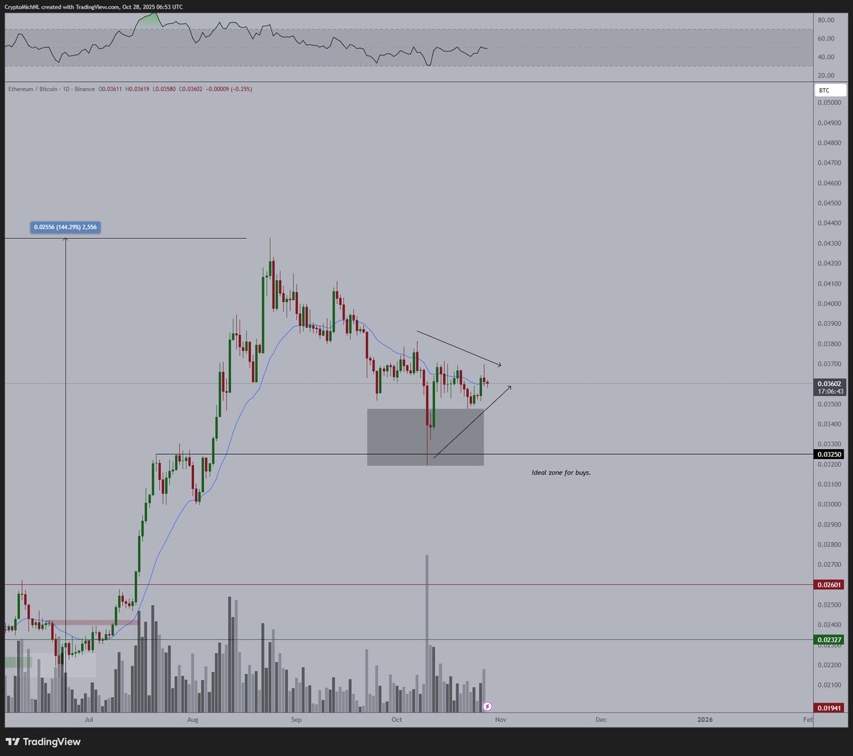 Supporting that view, Michaël van de Poppe observed that Ethereum is “squeezing toward a big breakout.” According to his chart, ETH’s price structure is tightening within a higher low formation. A confirmed breakout above the descending resistance could quickly propel ETH to around $5,000, especially if Bitcoin resumes its upward momentum.