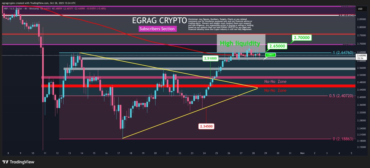 While Ethereum’s setup suggests major upside ahead, XRP’s chart is flashing short-term strength that could see it move before ETH. Analyst EGRAG Crypto highlighted XRP’s rebound from the $2.60 zone, calling it a key level that has now been defended multiple times. A decisive close above $2.65–$2.70 would confirm bullish continuation, potentially setting the stage for a renewed push toward the $3.00 region.