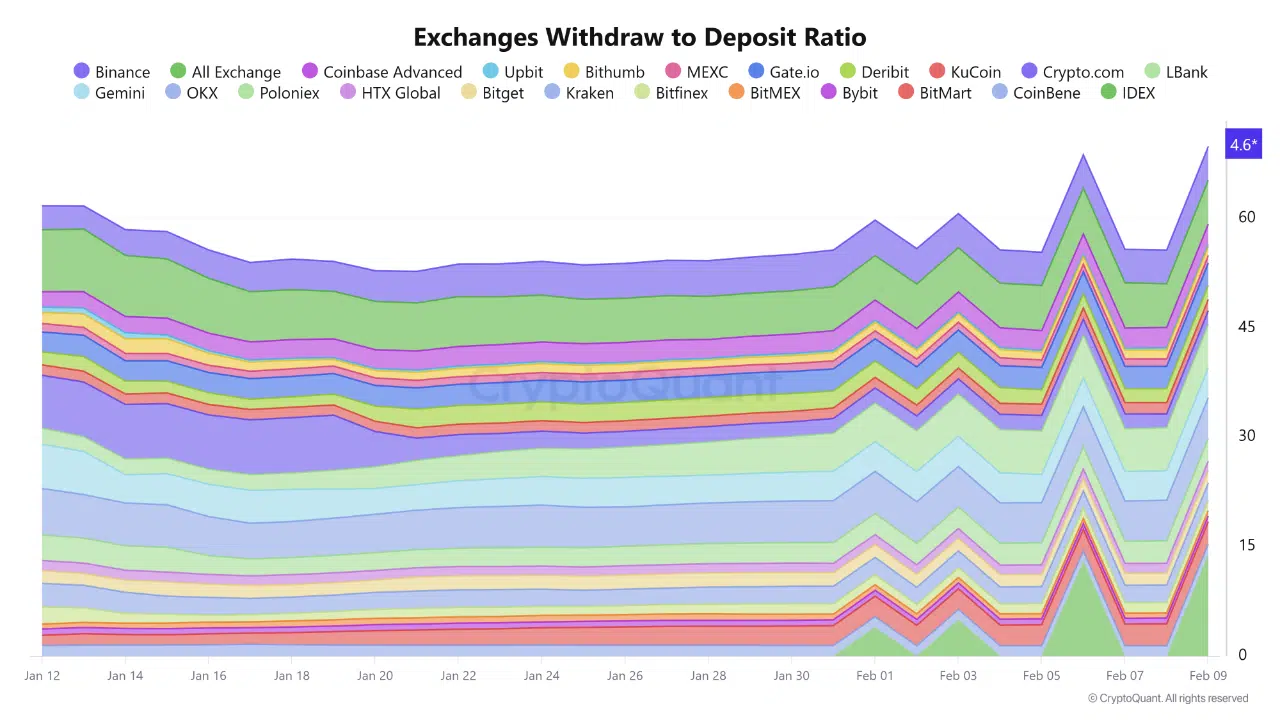 Binance did experience a sharp rise in withdrawals, increasing from roughly $420 million on January 12 to $5.94 billion by February 9. The platform’s withdrawal-to-deposit ratio reached 4.65, meaning users withdrew nearly five dollars for every dollar deposited during the period.