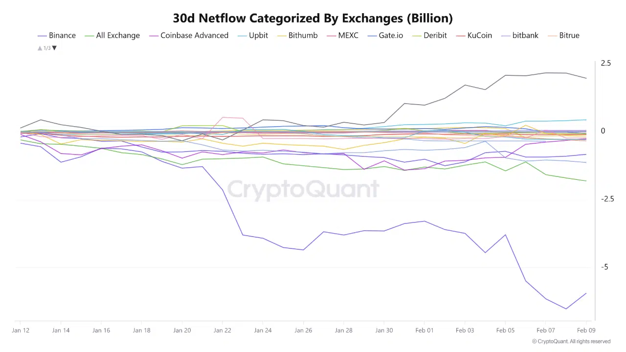According to a report shared by CryptoQuant, exchange data between January and February 2026 shows broad-based capital flight across the industry. What initially surfaced as “Binance FUD” aligns more closely with a generalized bearish withdrawal phase affecting most centralized exchanges.