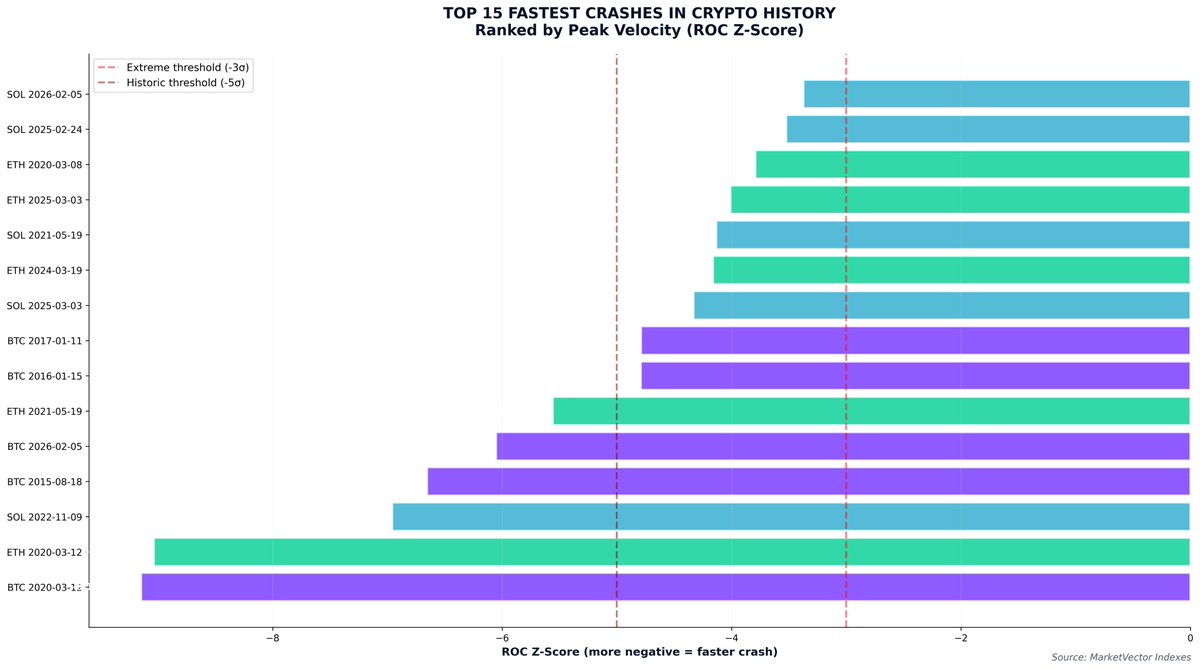 Data ranking the top 15 fastest crashes by peak velocity (ROC Z-Score) shows that speed, rather than absolute volume, is often the defining stress factor during sudden sell-offs. The chart also highlights a recurring pattern: the most rapid declines tend to normalize faster than slower, drawn-out crashes.