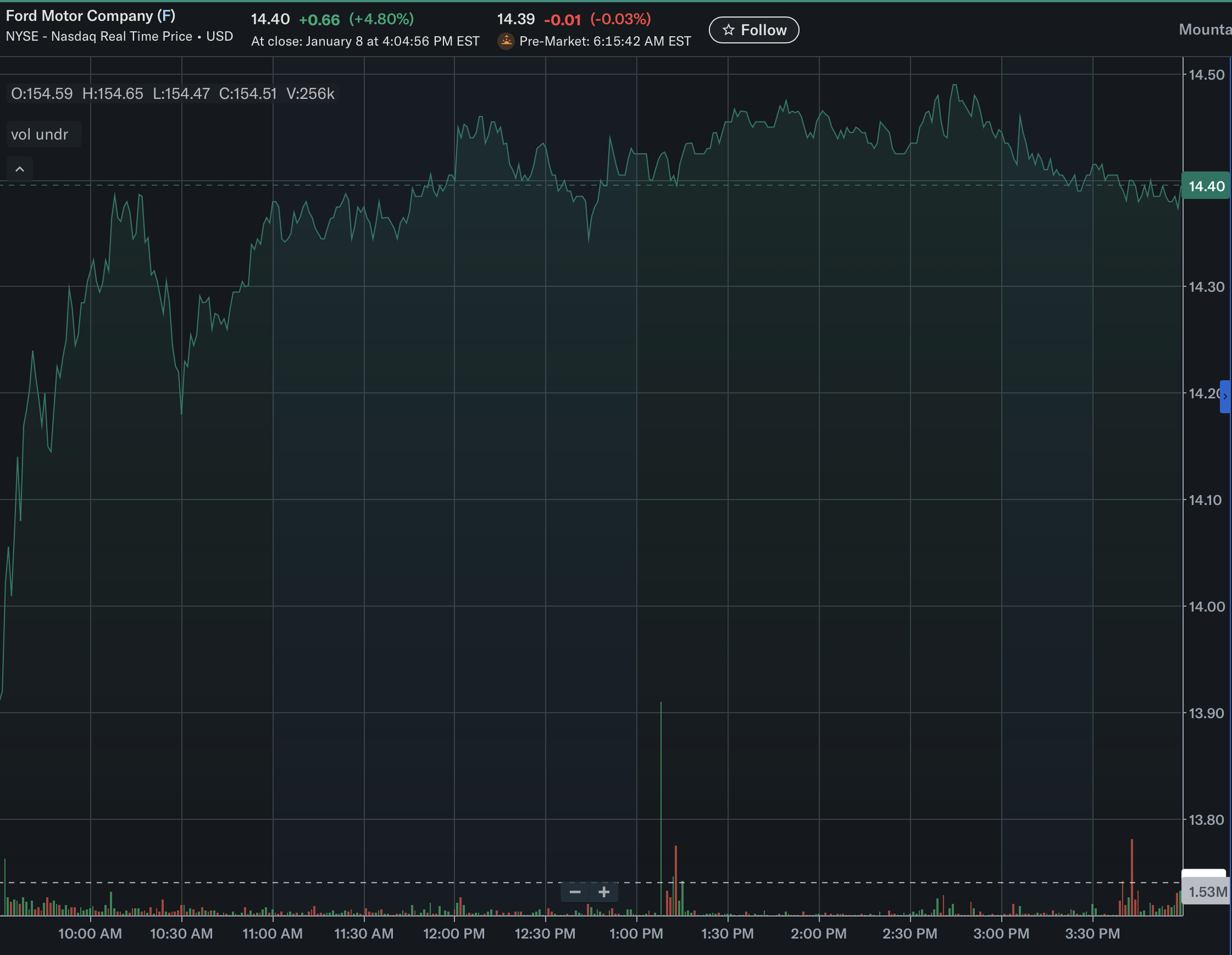 The stock touched $14.50 during trading on January 8, 2026, marking its highest level over the past year. Ford closed the session at $14.40, up $0.66, or 4.80%, from the prior close. Price action was active throughout the day, with early gains holding as the stock moved within a relatively tight range near the highs into the close. Pre-market pricing later showed the shares at $14.39, down $0.01.