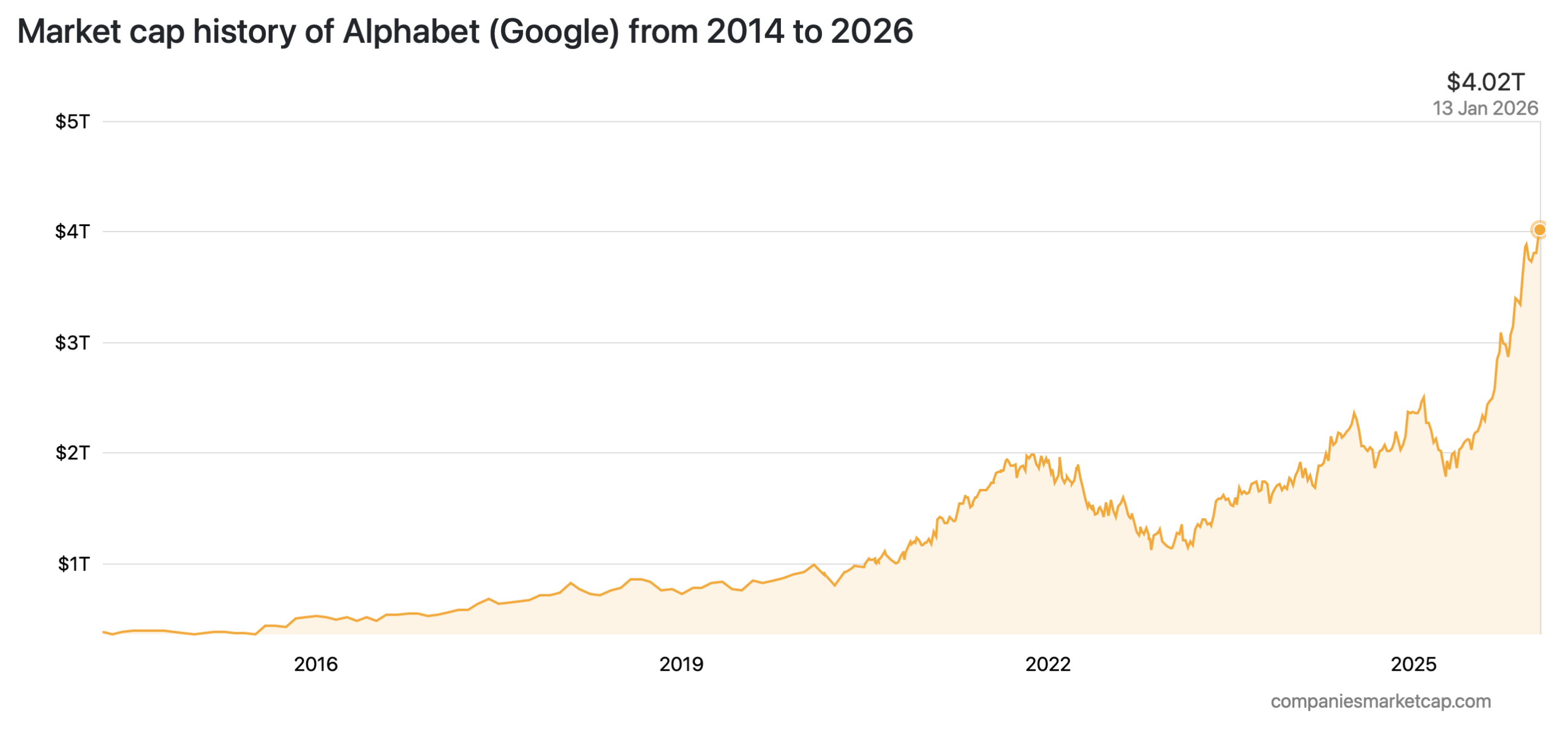 As of January 13, 2026, Alphabet’s market capitalization is shown at approximately $4.02 trillion.
