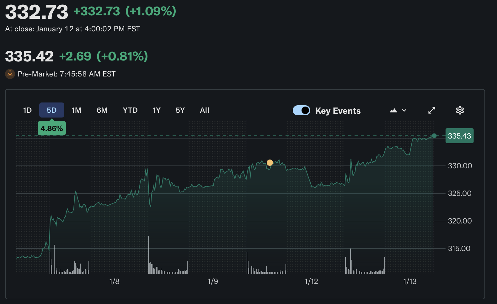 The short-term price chart shows Alphabet shares climbing from roughly $320 to above $335 within days, marking a near-5% gain over the five-day window. The rally accelerated into January 12–13, when the stock printed new highs and held firm into pre-market trading.