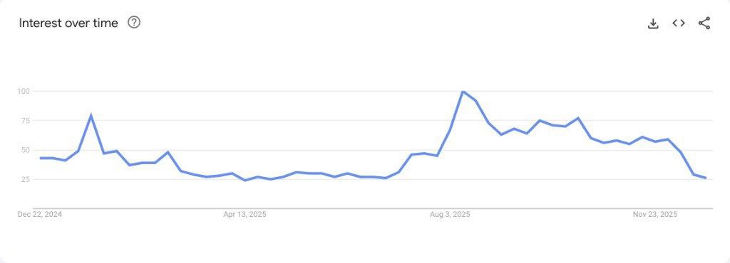 The chart tracks search interest from late 2024 through November 2025. After several brief spikes earlier in the year, interest began to fade consistently. The most notable surge occurred around mid-2025, when search activity briefly approached the top of the range. That move, however, was short-lived.