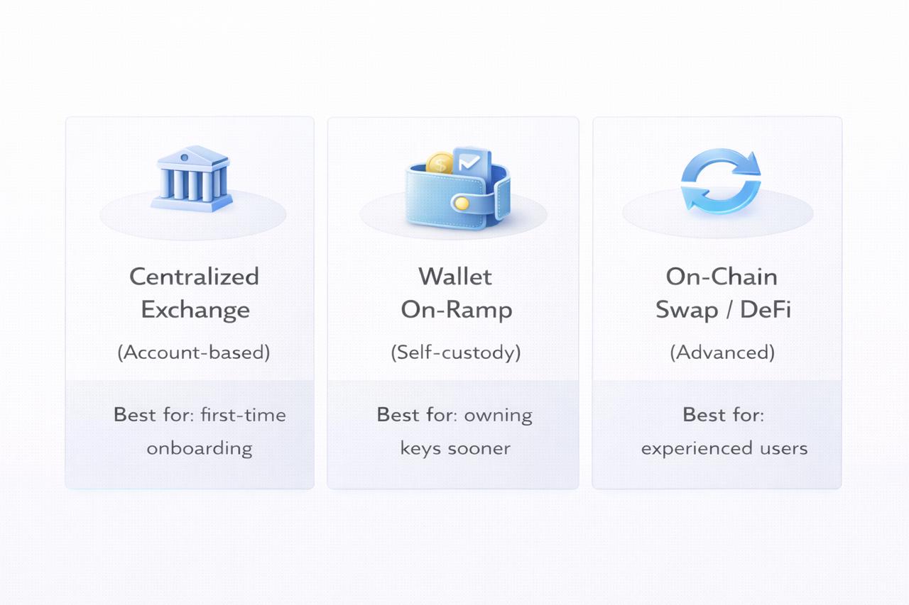 Centralized exchanges tend to be the default starting point because they combine onboarding, payments, and custody in one place. Across platforms, the steps are broadly similar even if the screens look different.