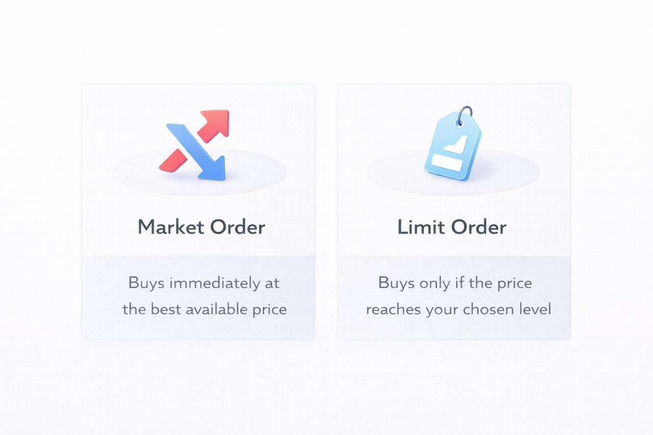 - Limit order: Buys only if the market reaches your chosen price.