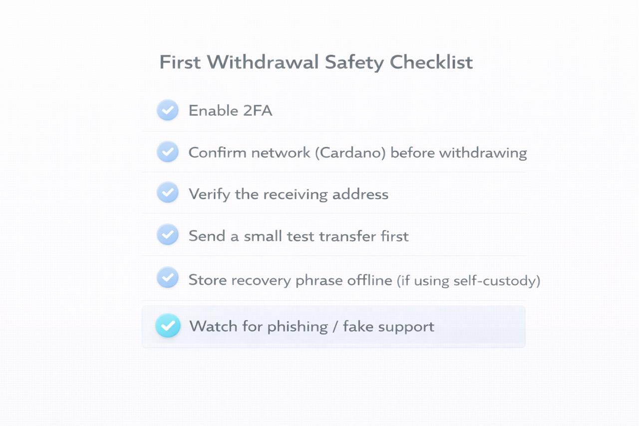 - Plan for small test transfers: If you withdraw, consider sending a small test amount first.