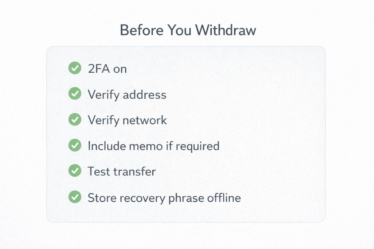 - Verify addresses and networks before withdrawing