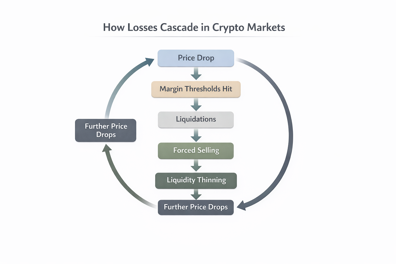 Reflexivity plays a central role. Falling prices trigger liquidations. Liquidations create additional selling pressure. This selling pushes prices lower, triggering further liquidations. These feedback loops can overwhelm fundamentals and execution quality alike.