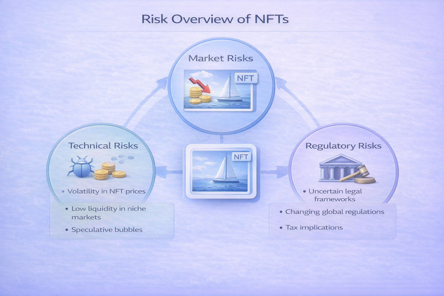 NFTs carry meaningful risks that should not be overlooked. Market volatility, thin liquidity, and speculative behavior can expose participants to sharp price swings and sudden losses, particularly in less established collections or platforms. In addition, technical vulnerabilities, evolving regulatory frameworks, and unresolved questions around intellectual property rights continue to shape both the opportunities and limitations of NFT adoption.