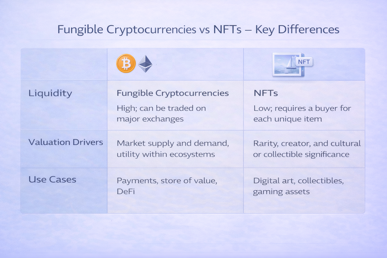 Although NFTs and cryptocurrencies share blockchain infrastructure, they serve fundamentally different purposes.