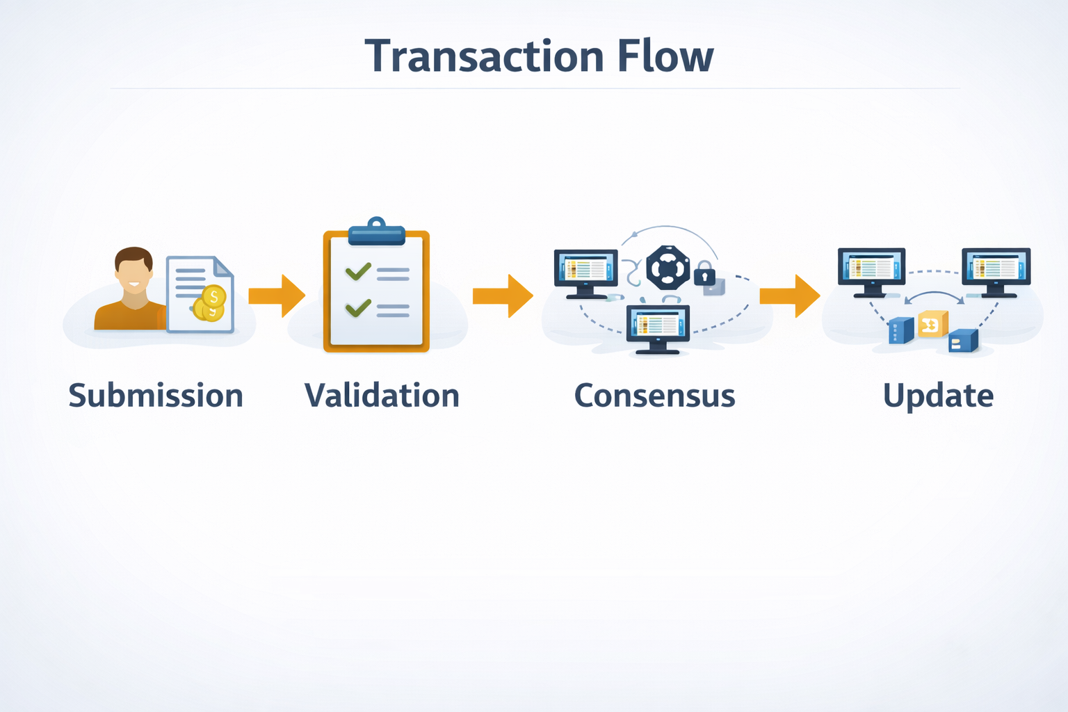Changes to the ledger are represented as transactions. These transactions are proposed to the system and evaluated according to predefined rules. Validation typically involves checking data integrity, verifying digital signatures, ensuring consistency with existing records, and confirming authorization where permissions apply.