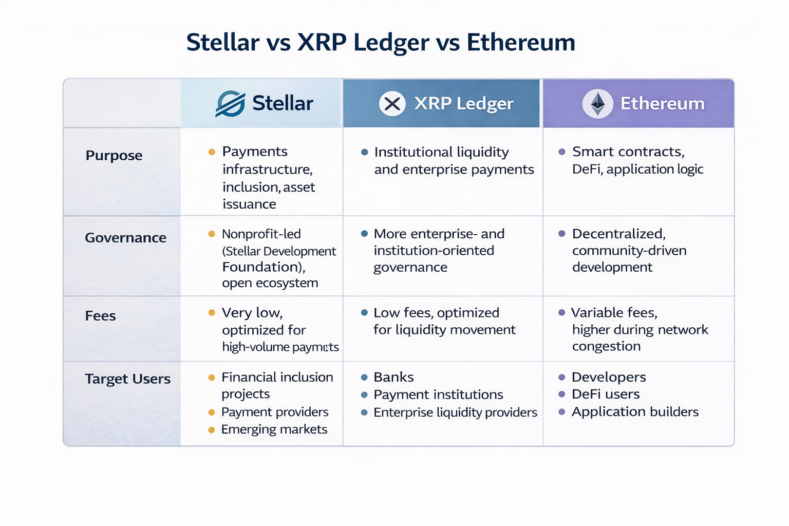 Stellar is frequently compared to other blockchain networks involved in payments or financial infrastructure, most notably XRP Ledger and Ethereum. While these networks sometimes intersect in use cases, their design priorities and philosophies differ in important ways.