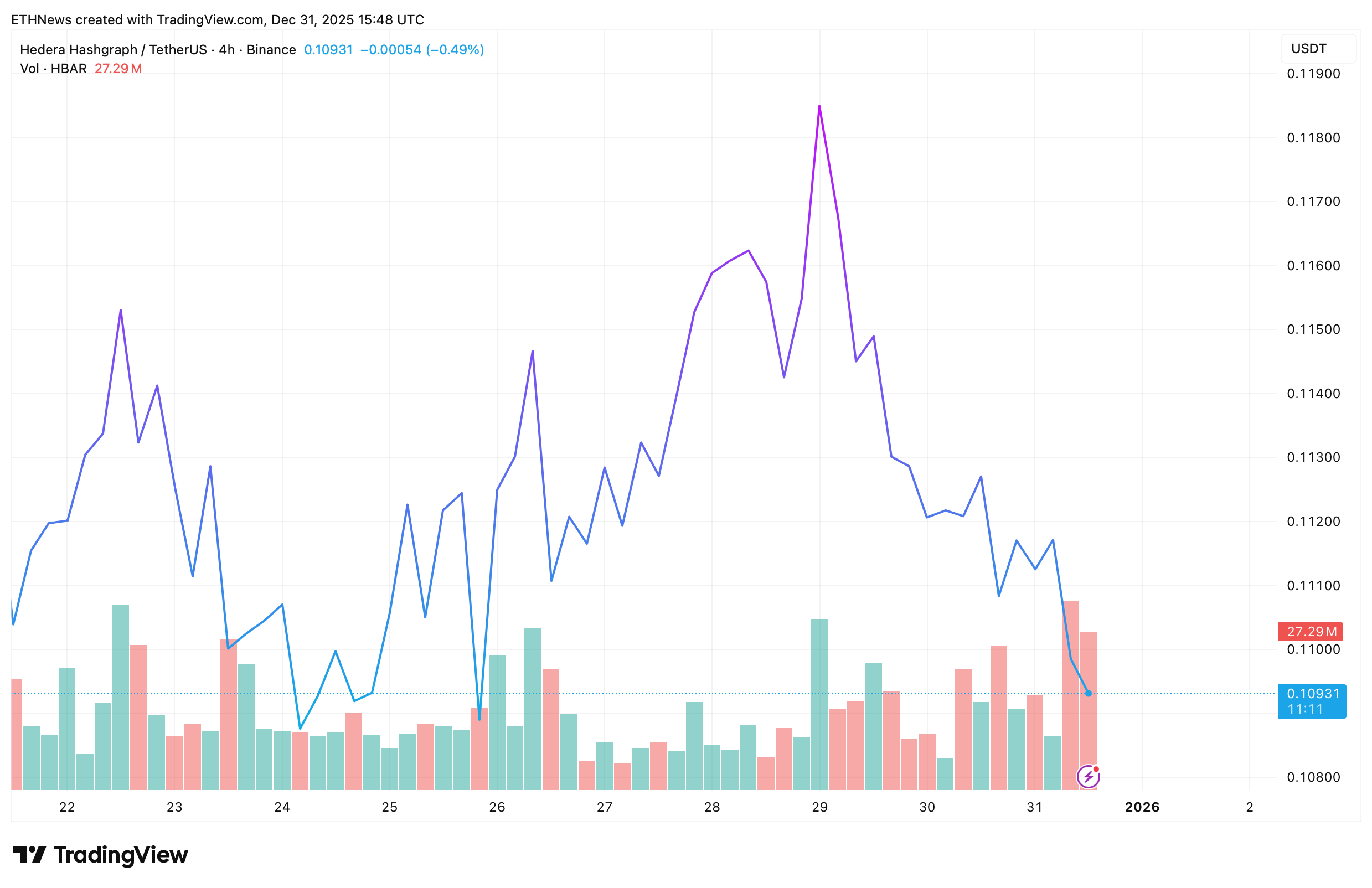 That higher-timeframe bias is echoed on the 4-hour TradingView chart. Around 15:50 UTC on December 31, 2025, Hedera Hashgraph was trading at $0.10931, down 0.49% on the session. Trading volume over the period measured 27.29 million HBAR.