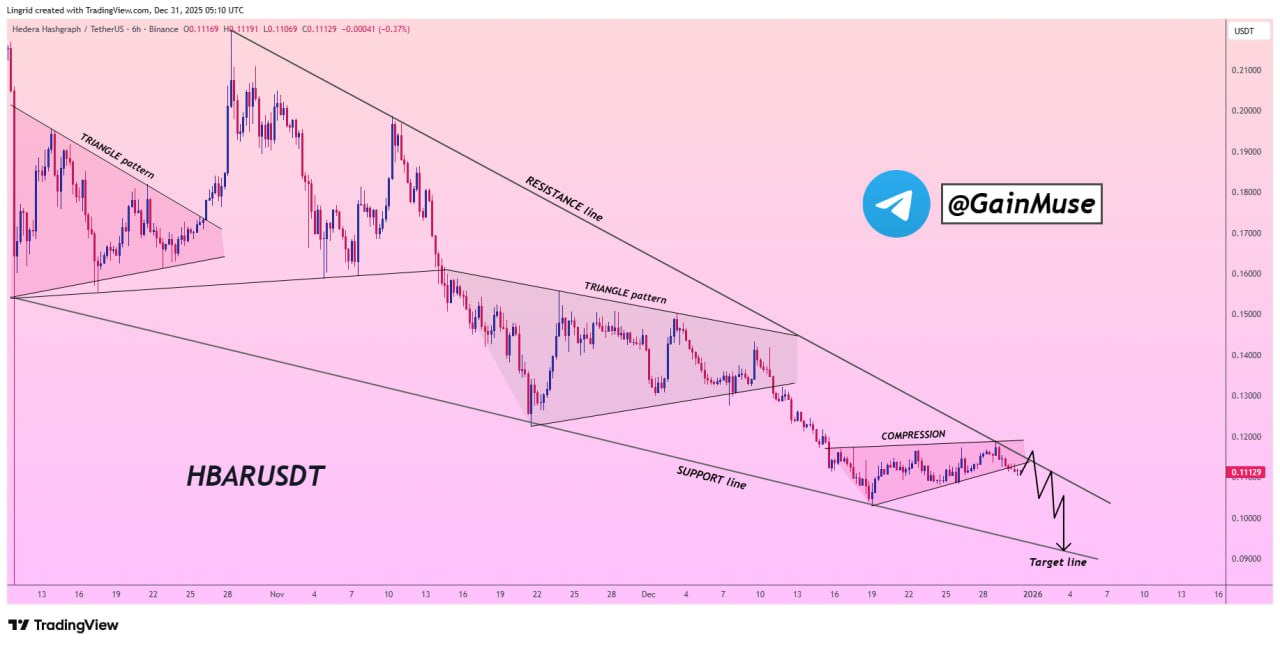 A higher-timeframe HBARUSDT chart shared by crypto trader Gain Muse highlights a prolonged descending channelthat has defined Hedera’s trend. Price remains capped beneath a clearly marked long-term resistance line, with each recovery attempt fading into lower highs.