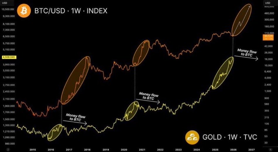 New chart highlights a recurring pattern between gold and Bitcoin that has appeared across multiple market phases.