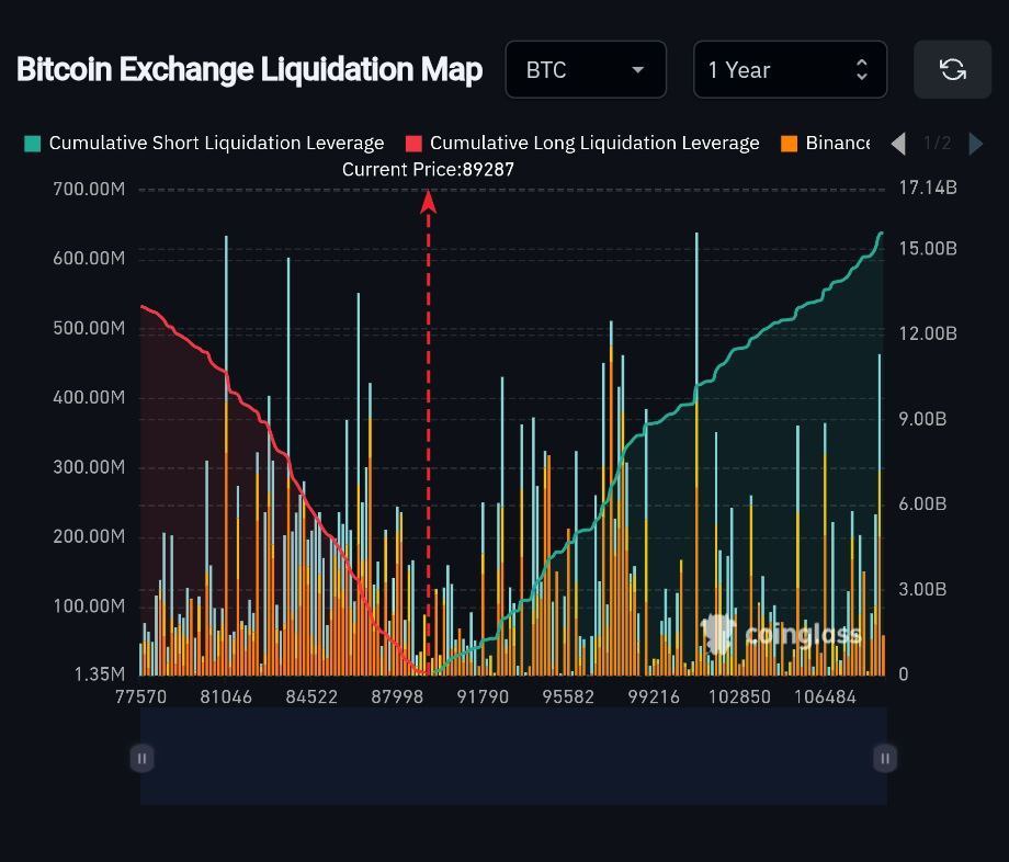 At the current price near $88,600, the chart highlights a clear imbalance between cumulative short and long liquidation leverage. On the upside, the green curve representing cumulative short liquidations rises sharply as price approaches the $100K zone, while downside long liquidations appear comparatively lighter and more dispersed.