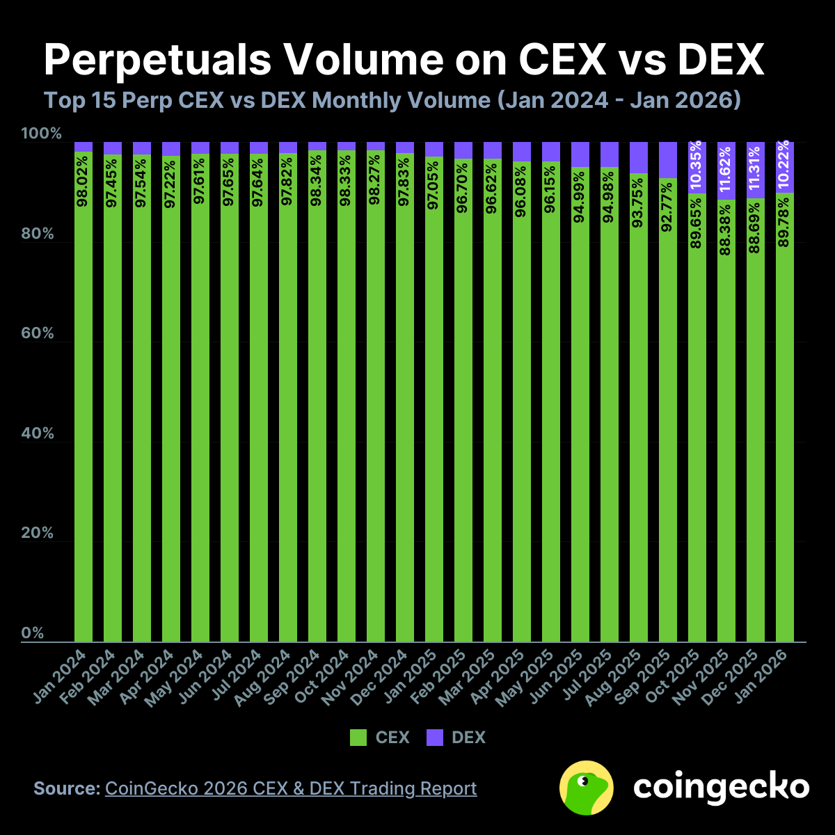 CoinGecko’s 2026 CEX and DEX Trading Report covering January 2025 through February 2026 shows DEX spot market share doubling from 6.9% to 13.6%, perp DEX volume growing 8x from $81.7 billion to $739.5 billion, and crypto exchanges recording over $2.4 billion in hack-related losses during the period.