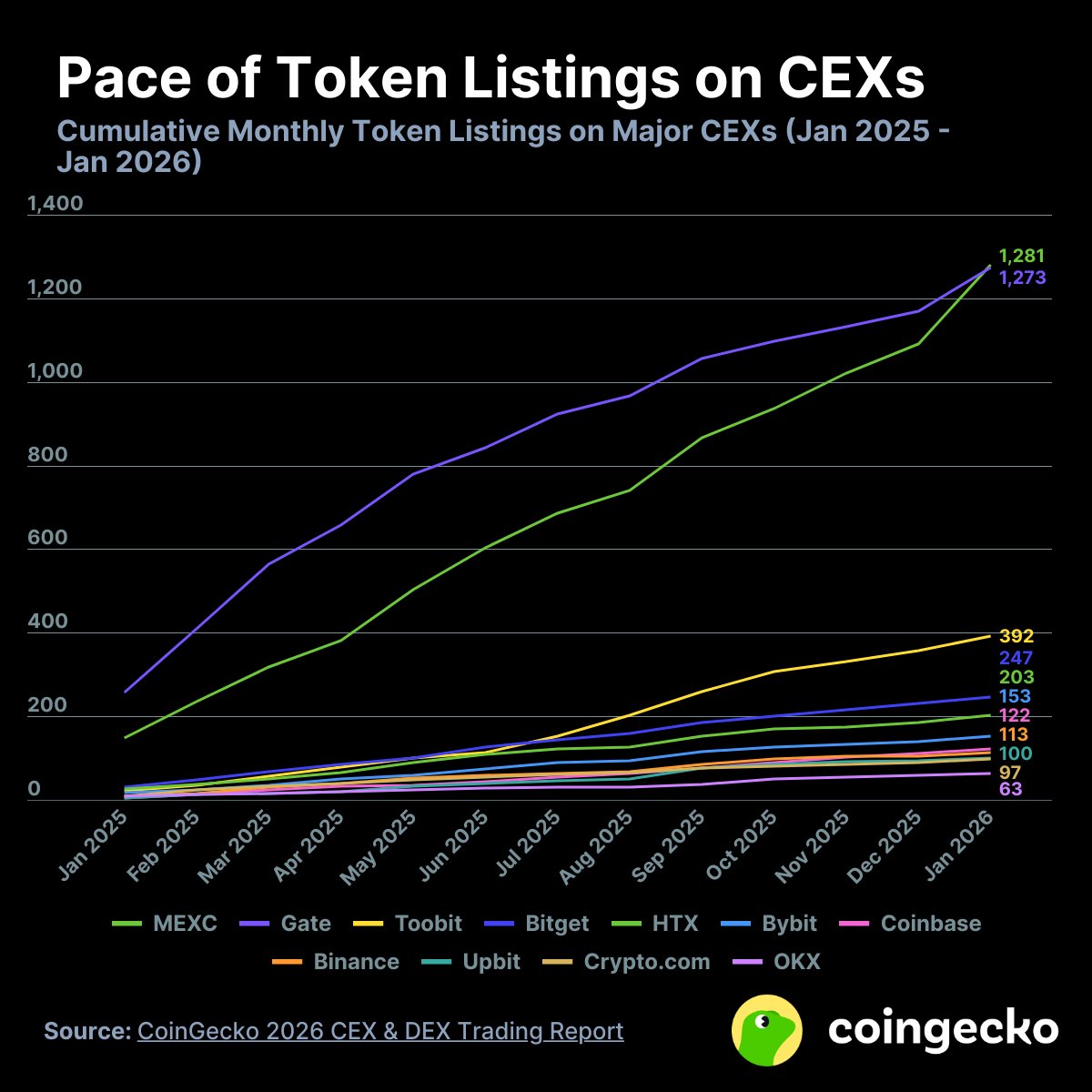CEXs listed approximately 100 tokens per month across the period. MEXC led with 1,281 cumulative listings over 13 months. Gate followed at 1,273. Toobit listed 392, Bitget 247, HTX 203. Binance listed 100 over the same period, a deliberate strategy of limiting listings to higher-quality projects rather than competing on volume.