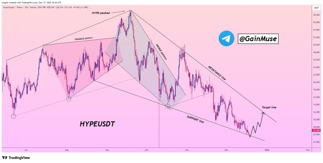 Technical chart shared by analyst GainMuse shows HYPE emerging from a long corrective phase following its peak earlier in the year.