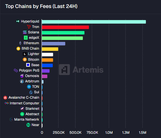 The Artemis top chains by fees chart has one bar that runs far beyond everything else. Hyperliquid at approximately $1.6 million. Then Tron at $703,500, Solana, and edgeX clustered around $650,000 to $750,000. Ethereum sits around $450,000. BNB Chain around $300,000. Then a long tail.