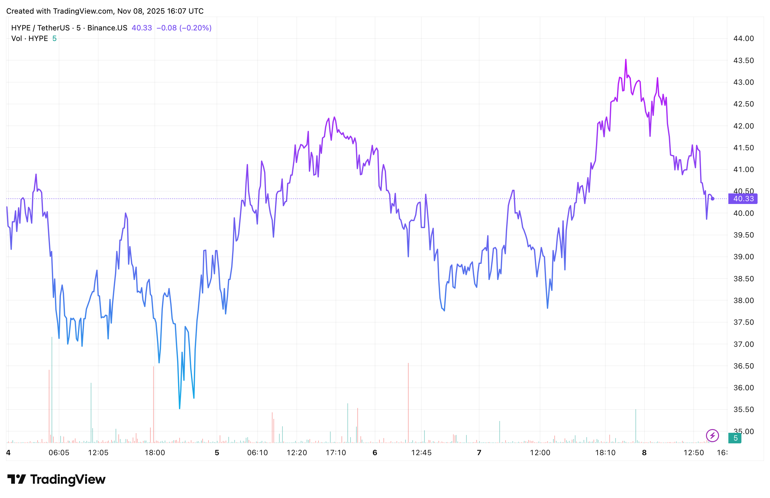 After a strong rally earlier this week that sent Hyperliquid (HYPE) to nearly $43, the token is now showing signs of fatigue. As of November 8, HYPE trades around $40.1, slipping 1.26% in the past 24 hours. The move comes after a volatile 48-hour period where the price briefly surged to $42.9 before losing momentum.