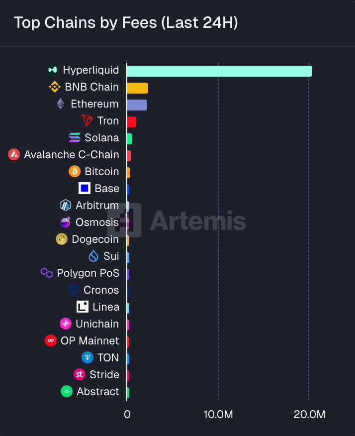 Hyperliquid has officially overtaken all major blockchains in daily network fees, generating over $20 million in the past 24 hours, far surpassing BNB Chain, Ethereum, and Solana, according to new data from Artemis shared by Cointelegraph.