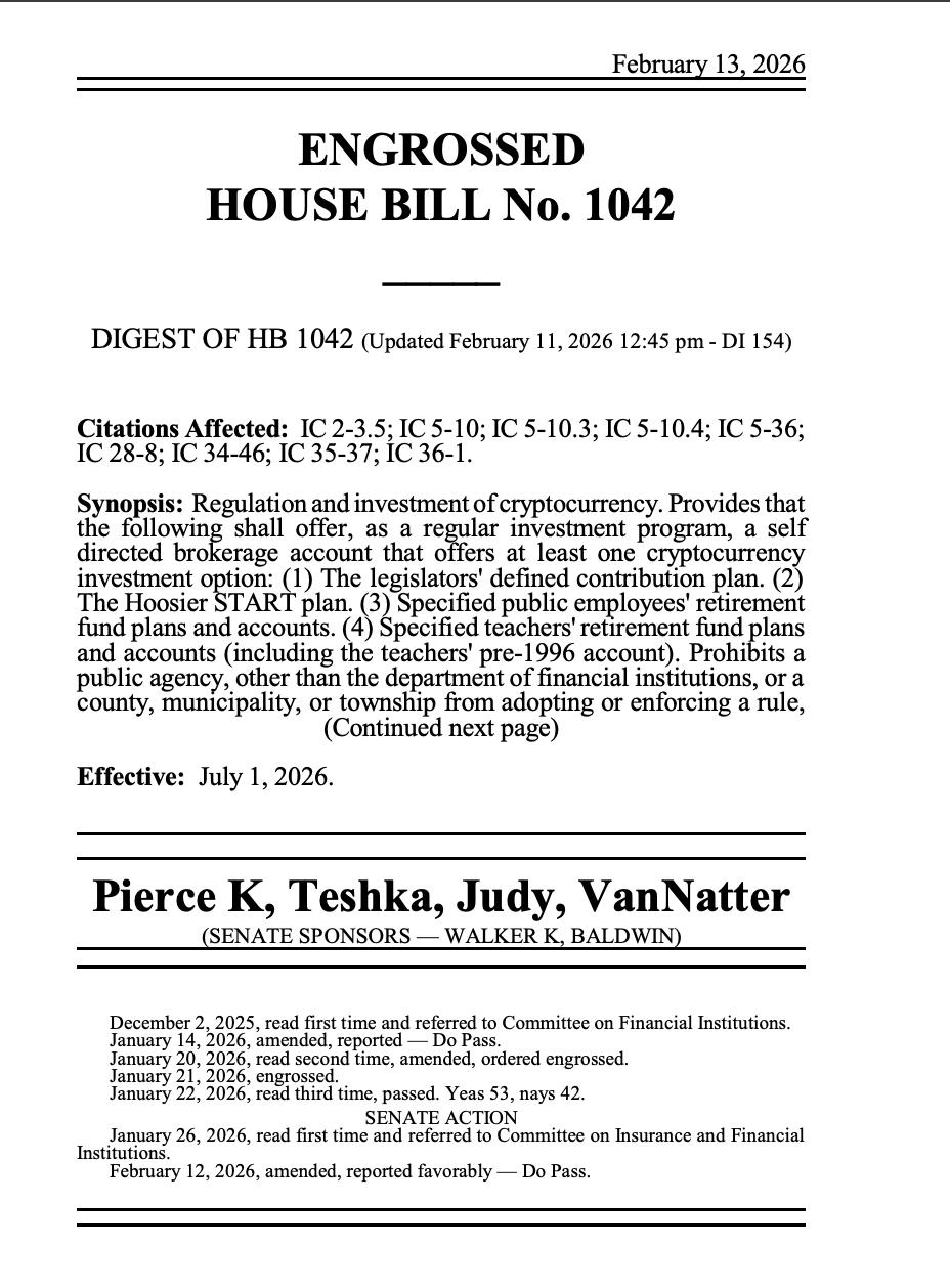 On February 12, 2026, a Senate committee advanced House Bill 1042 (HB1042), legislation that would allow certain state-managed retirement programs to offer cryptocurrency investment options.