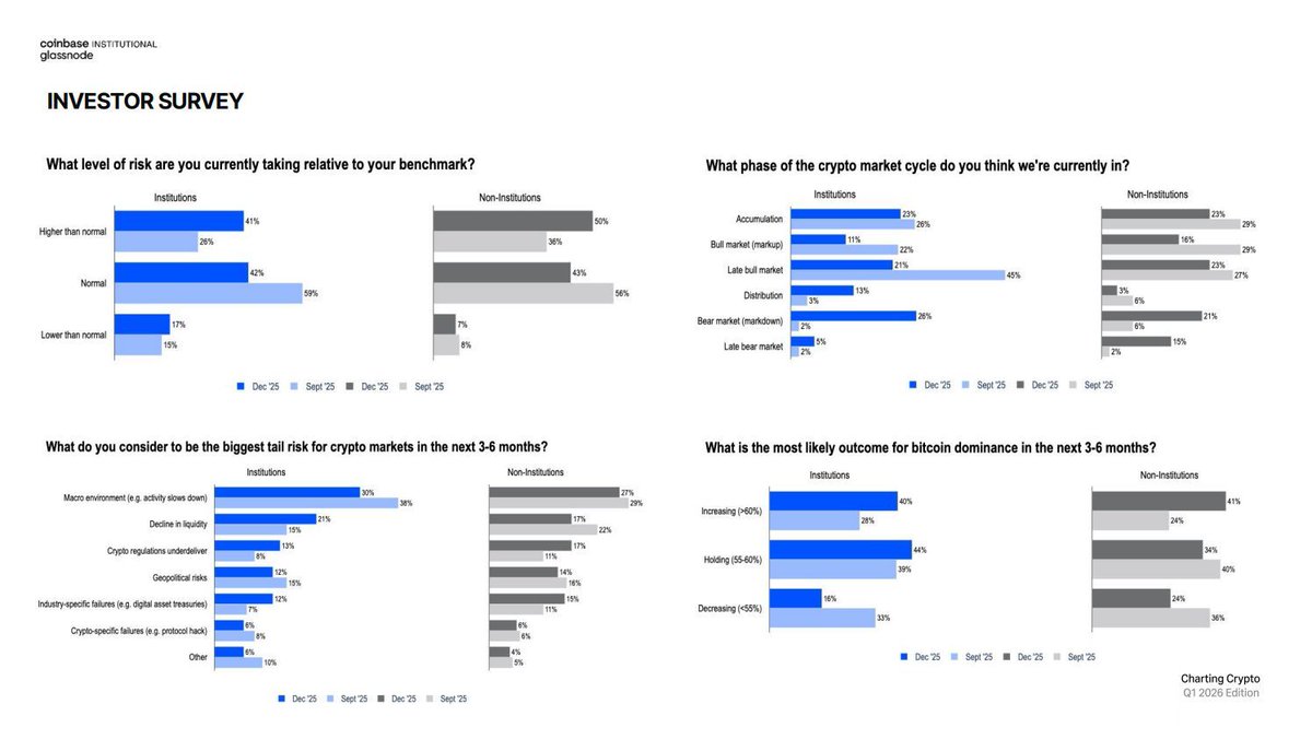 Yet portfolio actions tell a calmer story. Most institutions report having held or increased crypto exposure since October, with only a small fraction actively reducing risk or cutting positions.
